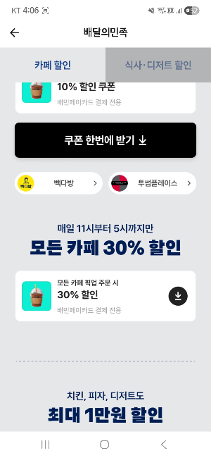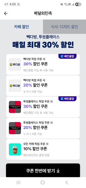 빽다방 아메리카노 100원 일반 할인 배민클럽 할인빽다방 20% 할인 30% 할인 투썸플레이스 20% 할인 30% 할인 모든 카페 공통 10% 할인 (배민페이카드 결제 전용) 📌 이번 100원 이벤트는 특별 쿠폰이기 때문에 기존 할인 쿠폰과는 별도로 사용됩니다.