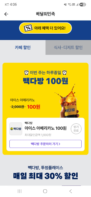 빽다방 아메리카노 100원 배민 앱 내 '카페 할인' 탭에서도 확인 가능하며,