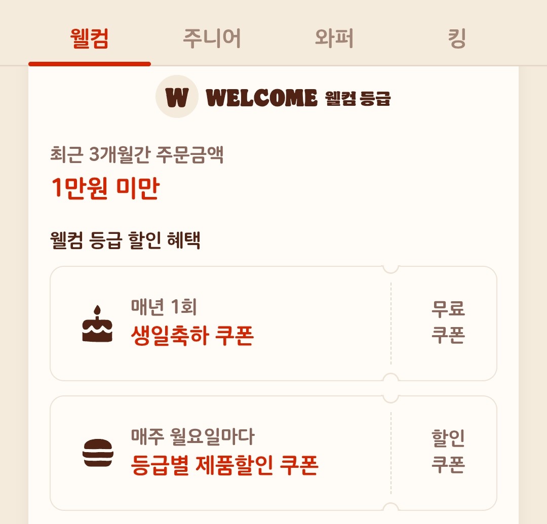 0123버거킹 할인 회원가입을 하면 웰컴, 주니어, 와퍼, 킹 등급으로 나눠져있어